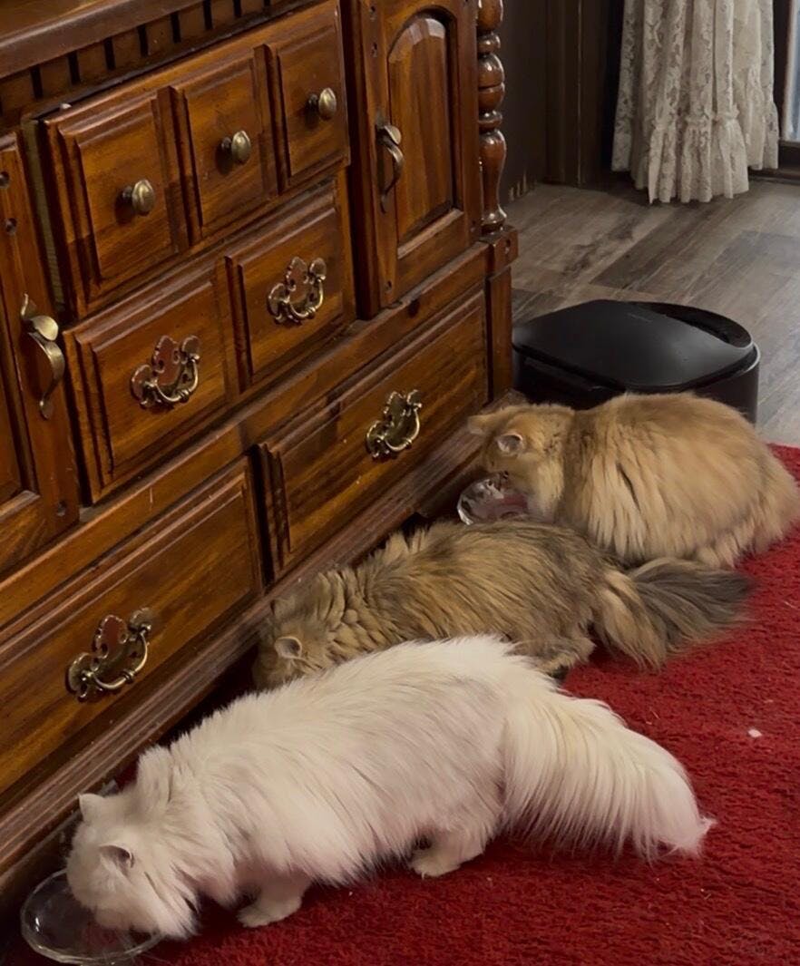 The cats have become con artists. They beg for food when my husband comes home from work like they haven’t been fed since they were in utero.