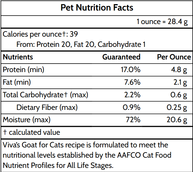 Goat, Goat Heart, Goat Bone, Goat Kidney, Goat Liver, Chilean Mussels, Organic Psyllium Husk, Organic Egg Yolk, Taurine, Organic Icelandic Kelp, Nutritional Yeast, Fish Oil, Cod Liver Oil, Vitamin E (Tocopherols), Oyster Meat, Manganese Proteinate